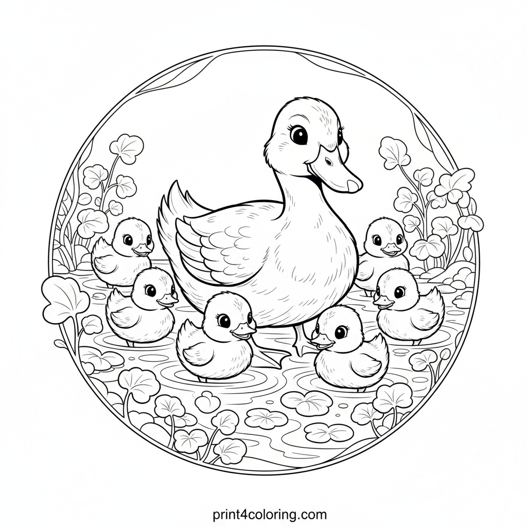 Dive into a delightful stream scene where a mother duck guides her adorable, fluffy ducklings! Watch them paddle through crystal-clear water, playfully exploring lush patches of intricate watercress. This cozy adventure invites you to add vibrant colors to every tiny detail, from feathers to leaves, bringing their serene world to life.