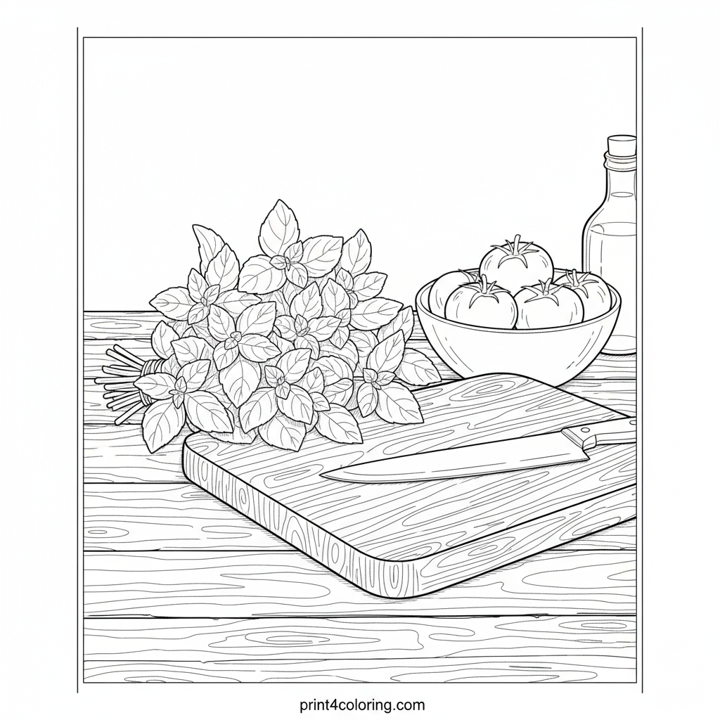 Discover a realistic kitchen scene! A vibrant bundle of fresh basil sits ready for a delicious meal. Color the rustic wooden cutting board, detailed chef's knife, ripe tomatoes, and olive oil. Focus on the rich textures of the basil leaves and wood grain to bring this culinary masterpiece to life.