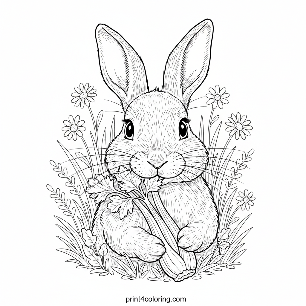 Meet our adorable garden bunny, enjoying a delicious, crisp celery snack! This close-up portrait highlights its soft fur, curious whiskers, and gentle nibbling. Surrounded by intricate blades of grass, delicate wildflowers, and sunlit garden greens, this scene invites you to bring its charming world to vibrant life with your favorite colors.