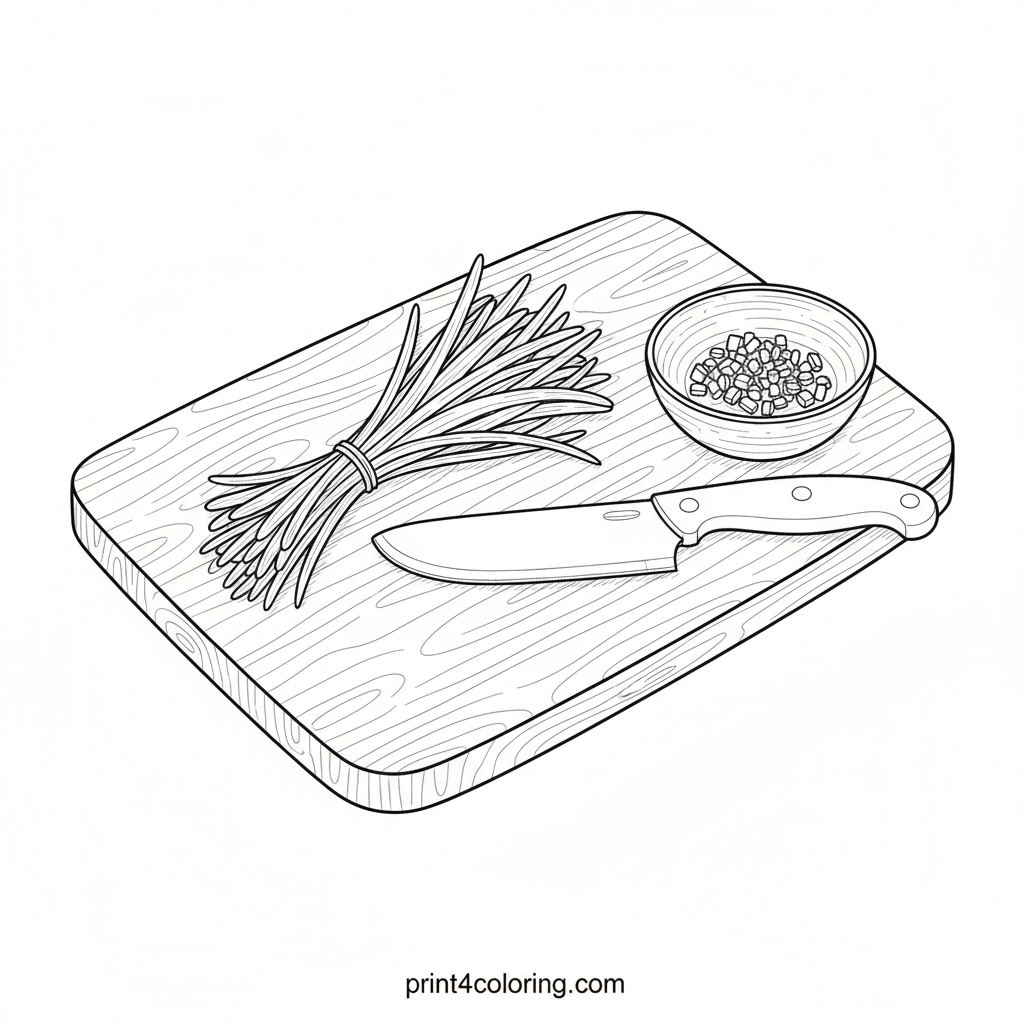 Explore a cozy kitchen scene! Fresh chives sit on a sturdy wooden cutting board, ready for chopping. A child-safe knife and a small bowl of finely cut chives complete this delightful still life. Focus on the rich textures of wood, ceramic, and chive leaves as you bring this garden moment to life.