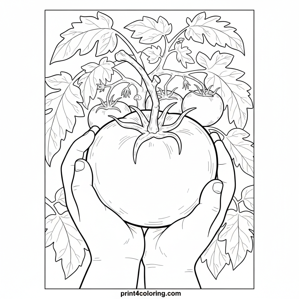 Dive into the joy of gardening with this detailed coloring page! Capture the moment a child's hand gently picks a ripe, red tomato from its vine. Explore the intricate details of the tomato's stem, lush green leaves, and other growing tomatoes in the background. A perfect scene for budding gardeners and artists!