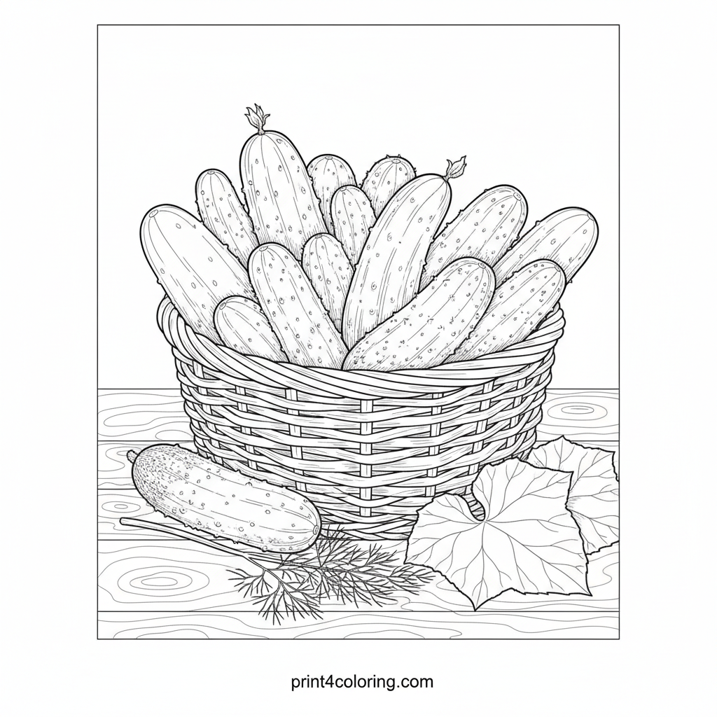 Dive into a delightful harvest scene! This intricate page features a rustic basket brimming with various freshly picked cucumbers, each with unique textures. Loose leaves and fragrant dill rest beside it, creating a rich tapestry of garden bounty ready for your creative colors.
