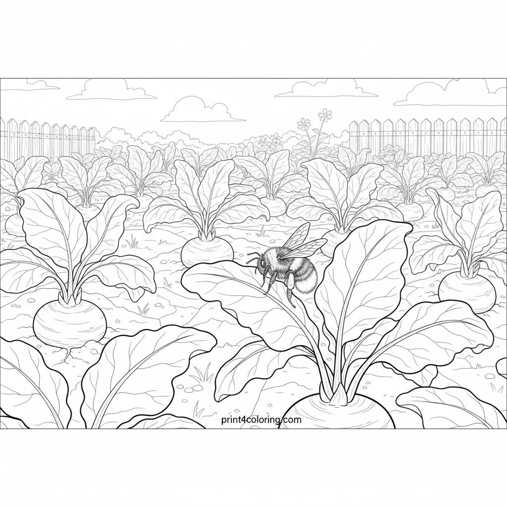 Dive into a vibrant garden scene where plump turnip plants thrive in sunny rows. Observe their large, textured green leaves fanning out gracefully. A fluffy bumblebee, diligent and buzzing, is carefully landing on a leaf, ready to gather pollen. This detailed page invites you to bring the garden's gentle rhythm to life with your colors.