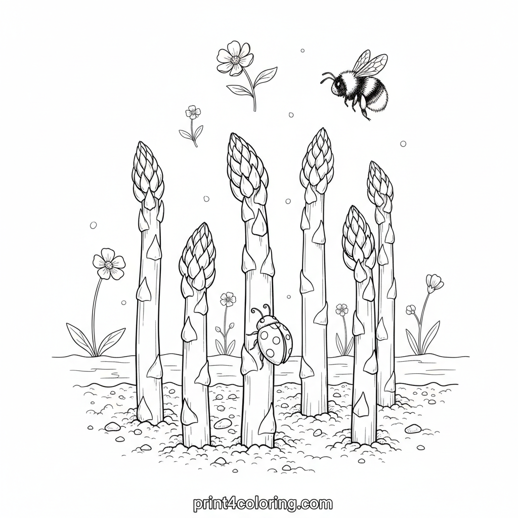 Explore a vibrant garden scene where delicate baby asparagus spears reach for the sun. A friendly ladybug with bright spots crawls on a stalk, while a busy bumblebee buzzes near a sweet wildflower. This detailed illustration offers a rewarding challenge for expert colorists.