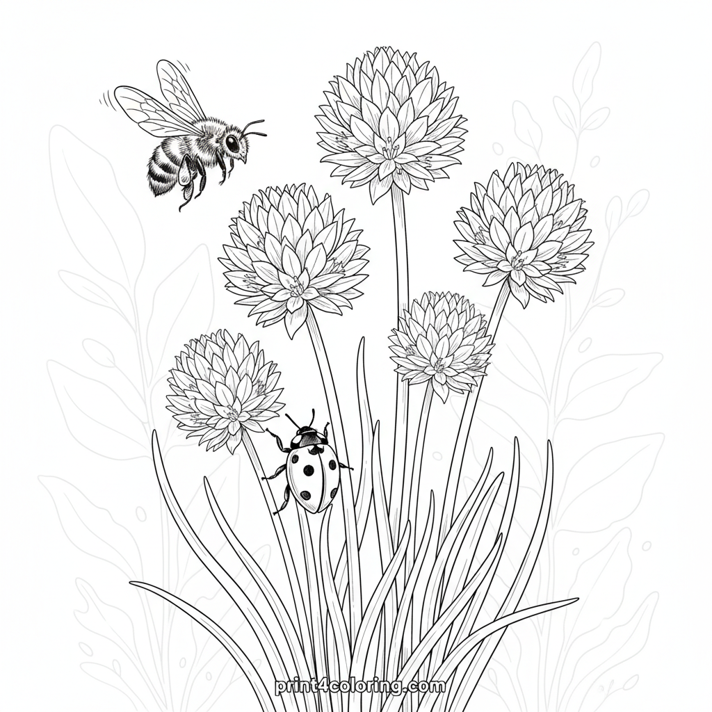 Explore the bustling world of chives! This detailed scene features a cluster of chive plants with their beautiful purple flowers. A friendly ladybug carefully climbs a stalk, while a busy bee buzzes near a blossom, collecting nectar. Discover the magic of a garden's tiny treasures and bring this vibrant ecosystem to life with your colors!