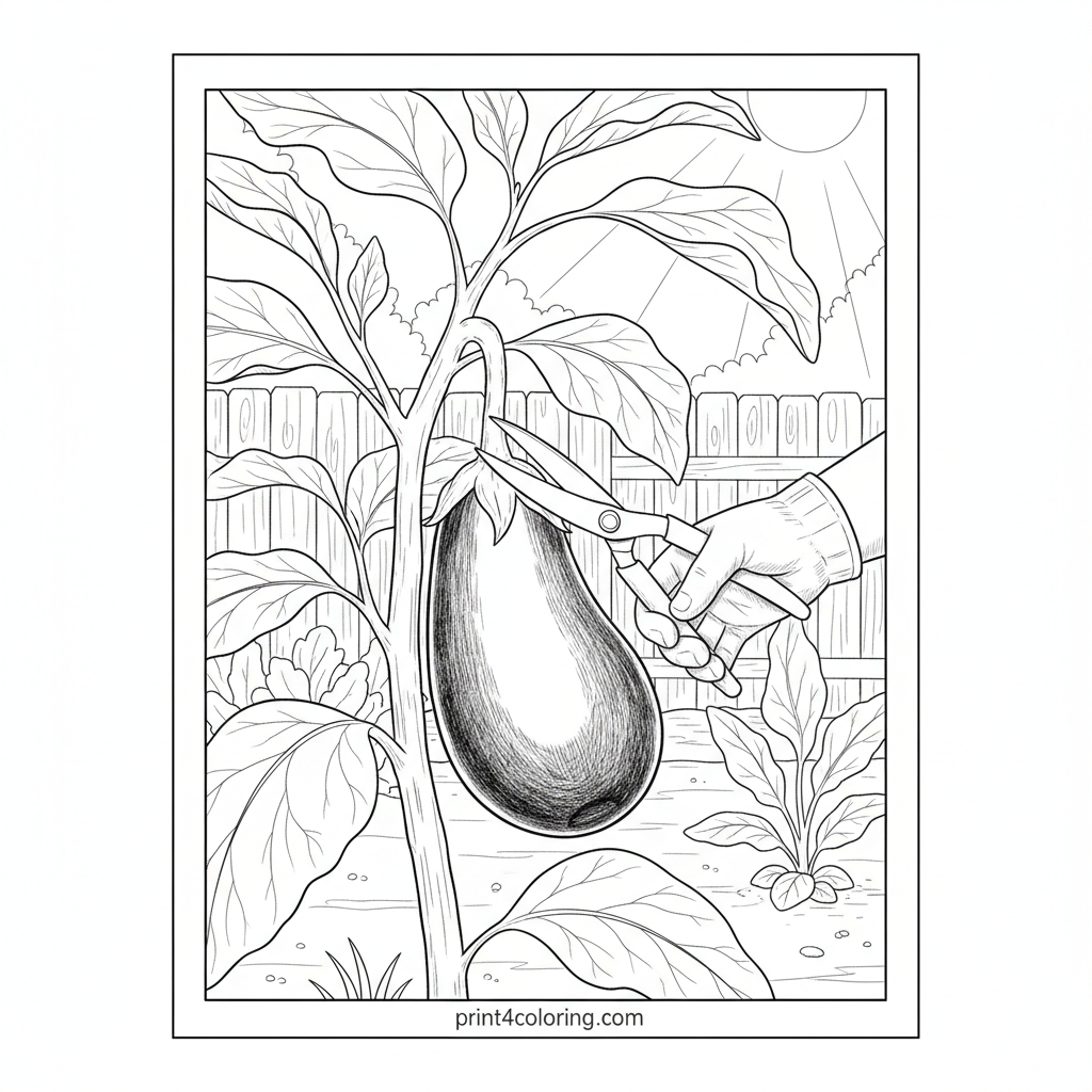 Experience the gentle art of harvesting! This detailed coloring page shows a hand carefully snipping a large, glossy eggplant. Focus on the intricate textures of the eggplant's smooth skin, the rough stem, and veined leaves, all set against a blurred, sunny garden backdrop. A rewarding challenge for expert colorists.