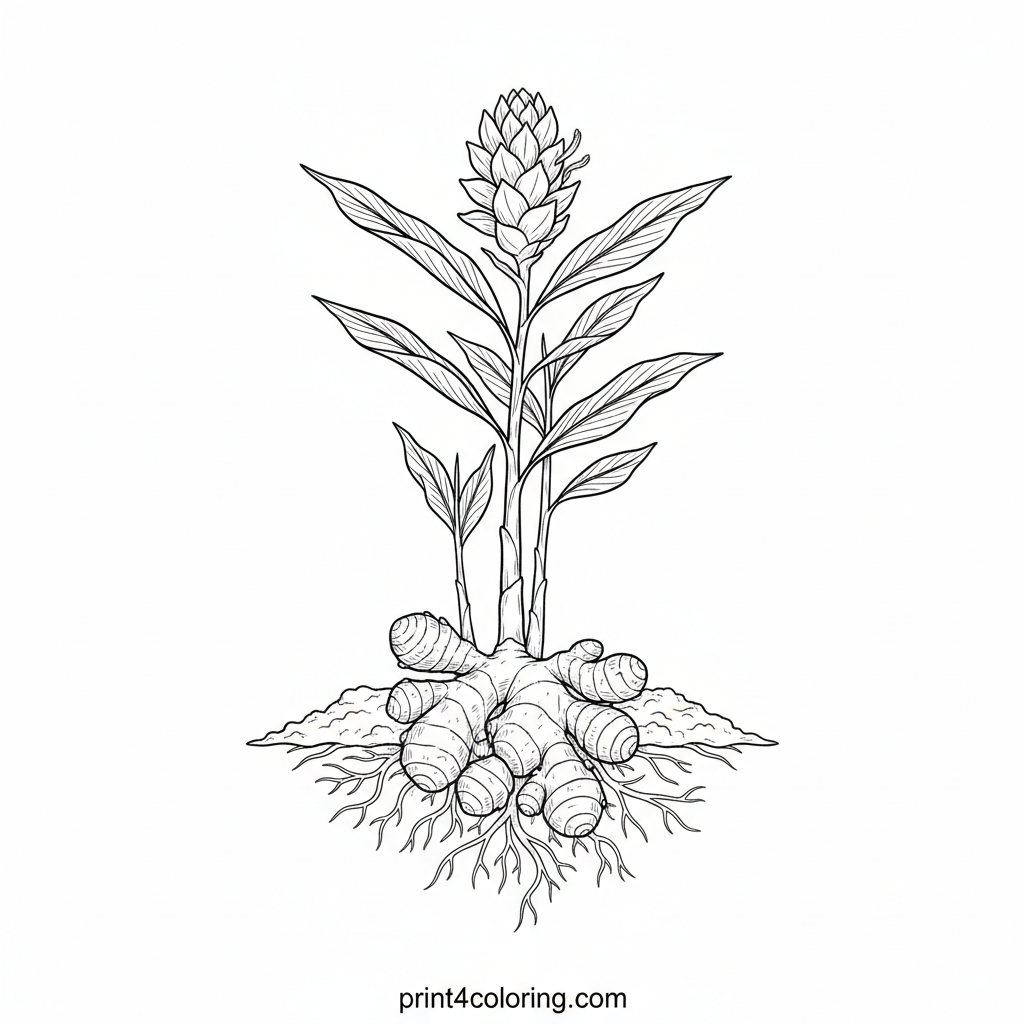 Explore the amazing world of ginger with this detailed coloring page! Discover the textured underground rhizome, delicate roots, and leafy stems reaching for the sun. A beautiful, exotic ginger flower blooms, inviting you to bring its intricate beauty to life with your expert coloring skills.