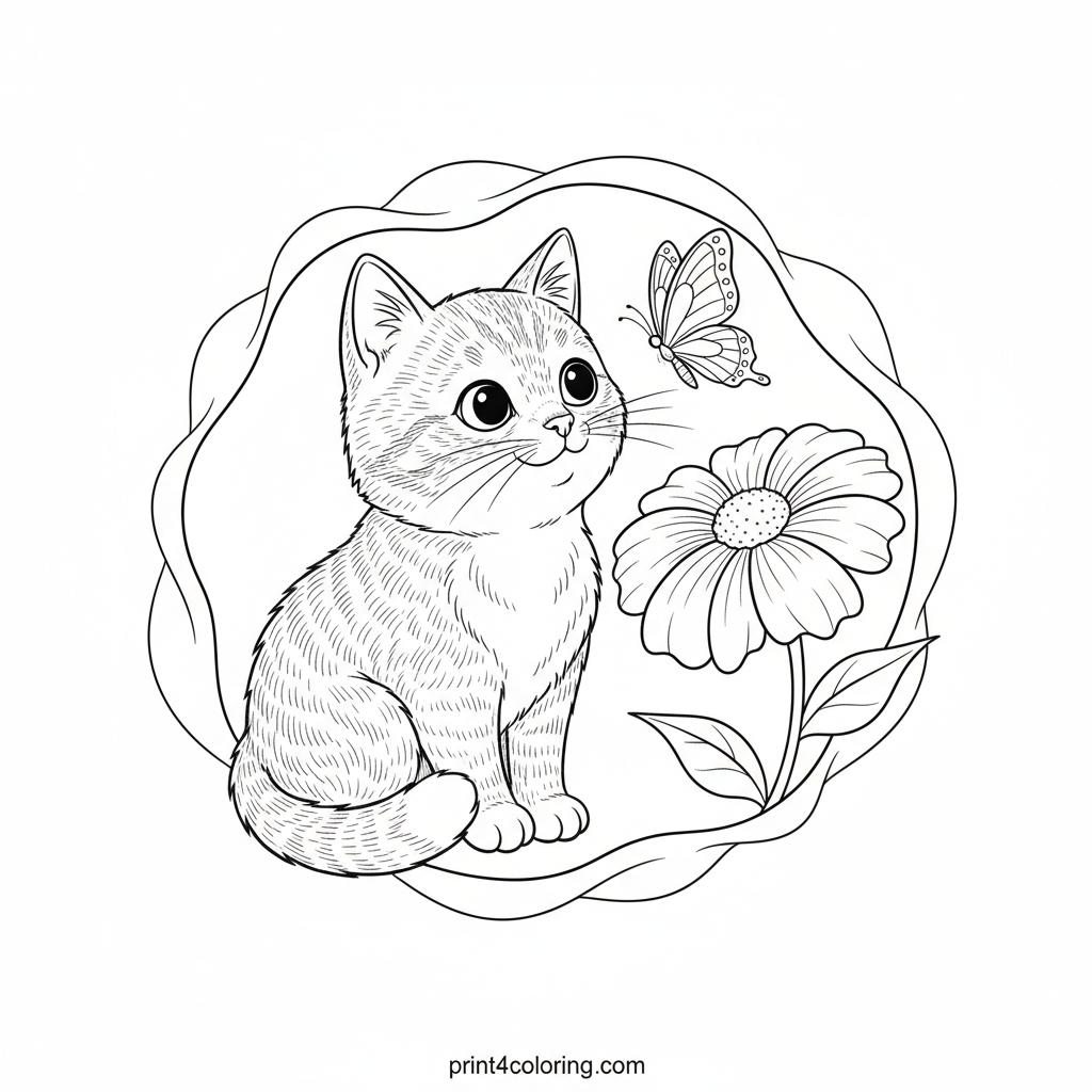 Meet a curious ginger tabby cat in a cozy garden, its bright eyes watching a butterfly land on a blooming flower. This highly detailed sketch captures realistic fur texture and delicate whiskers, perfect for expert colorists to bring this friendly feline moment to vibrant life.