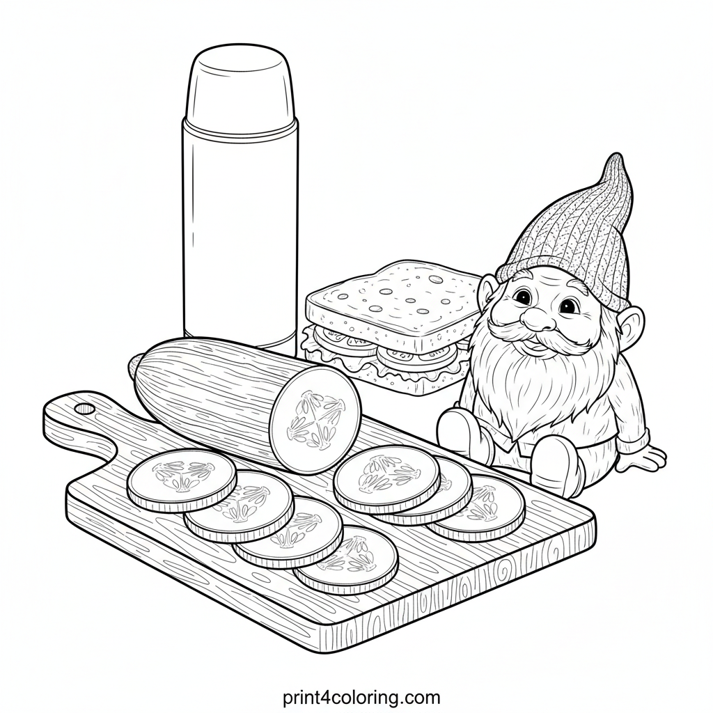 Step into a charming garden scene where a delightful picnic is being prepared! A perfectly sliced cucumber awaits on a wooden board, watched by a curious garden gnome. Discover other yummy details like a simple sandwich and thermos, all ready for a beautiful outdoor feast. A detailed challenge for aspiring artists!