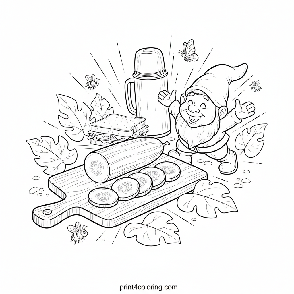 #picnic#garden#gnome#food#cucumber#outdoor#still-life#preparations#coloring-page#printable