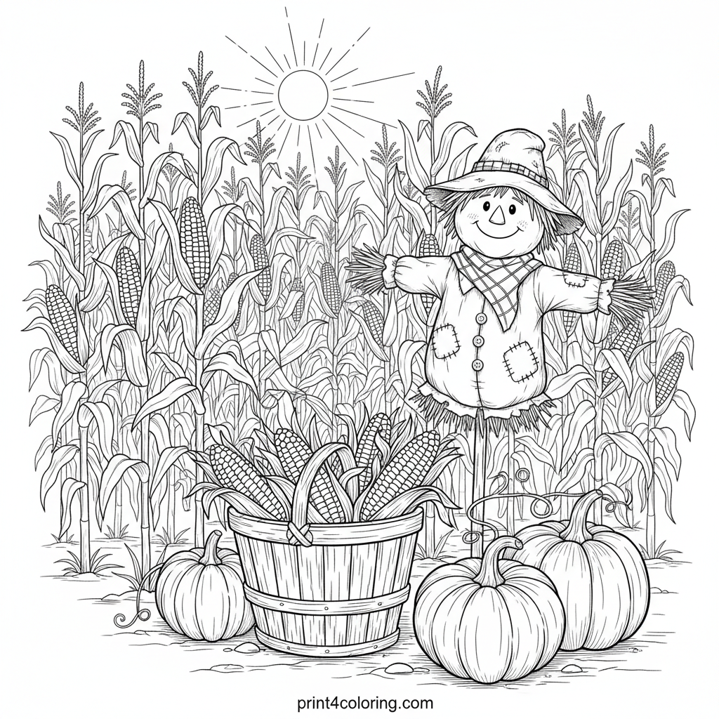 Step into a bountiful autumn scene! This detailed coloring page features a sunny maize field with tall, ripe corn stalks and a friendly scarecrow. Discover a rustic basket overflowing with freshly picked corn and plump pumpkins, ready for harvest. A perfect picture to celebrate the joys of fall!