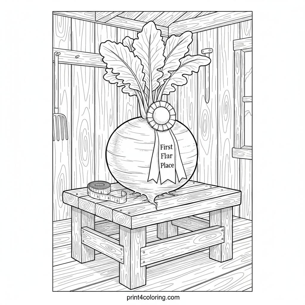 Imagine the biggest, most perfect turnip you've ever seen! This magnificent root vegetable has just won first place, proudly wearing its blue ribbon. It rests on a rustic stand, with an old-fashioned measuring tape nearby to show just how enormous it is. Get ready to add vibrant colors to this prize-winning scene and celebrate nature's bounty!