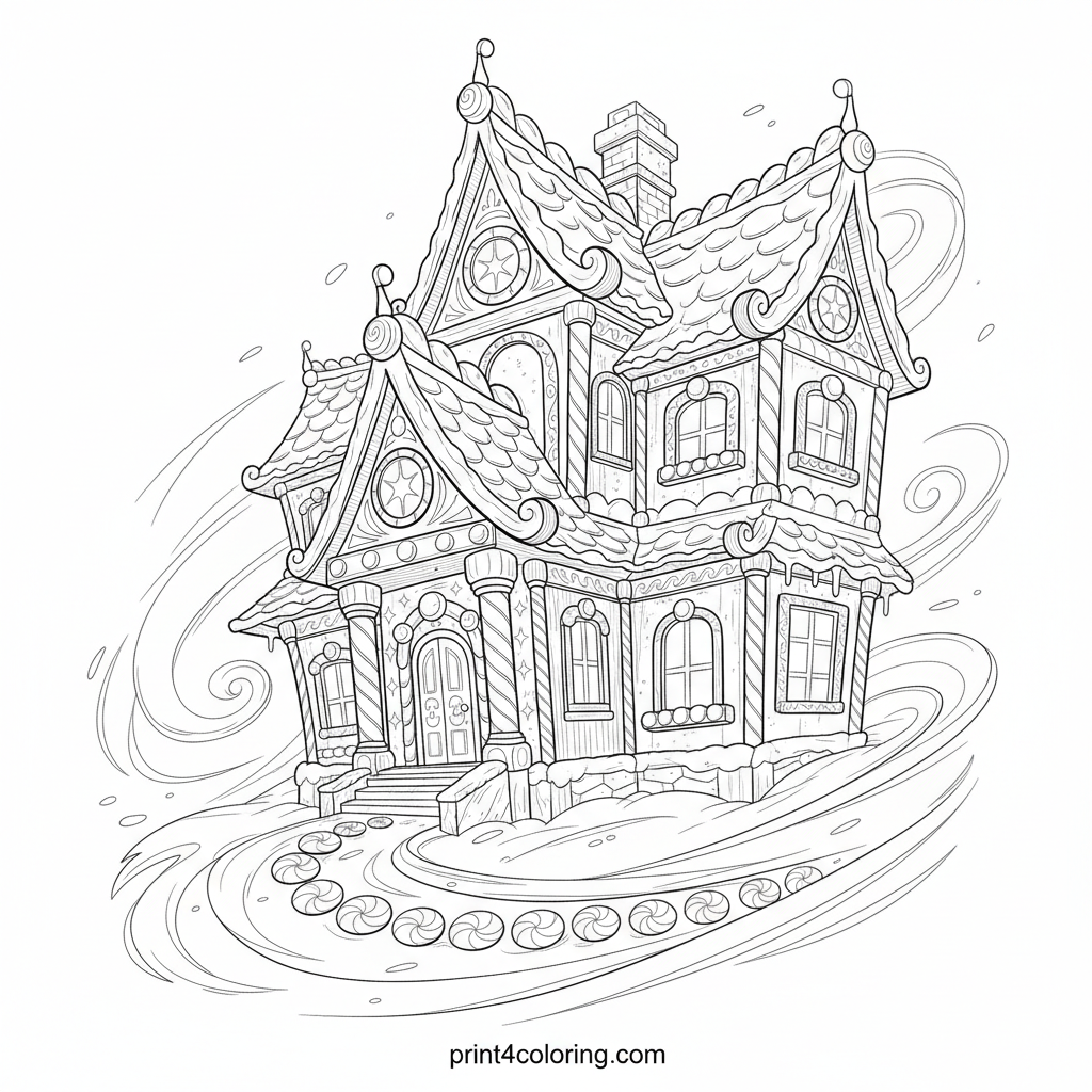 Unleash your expert coloring skills on this grand gingerbread mansion blueprint! Explore intricate candy cane columns, frosted eaves, and gumdrop windows. A peppermint path leads to this sugary masterpiece, set against a subtle snowy backdrop, waiting for your creative colors to bring its edible architecture to life.