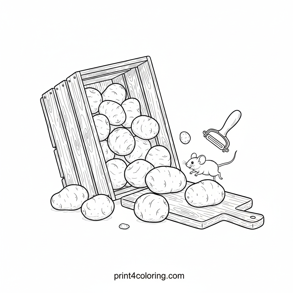 Explore a rustic still life featuring a wooden crate brimming with freshly dug potatoes. Next to it, a cutting board and peeler are ready for meal prep. A tiny, friendly field mouse peeks out, adding whimsy to this detailed harvest scene. Perfect for coloring natural textures!