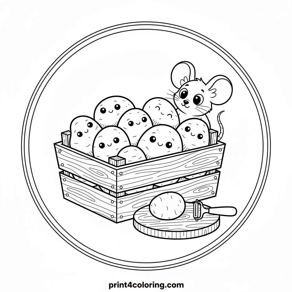 Step into a cozy kitchen scene! A rustic crate brims with freshly dug potatoes, ready for a delicious meal. Next to it, a cutting board and peeler await. A tiny, friendly field mouse peeks out, curious about the preparations. Bring this charming harvest moment to life with your colors!