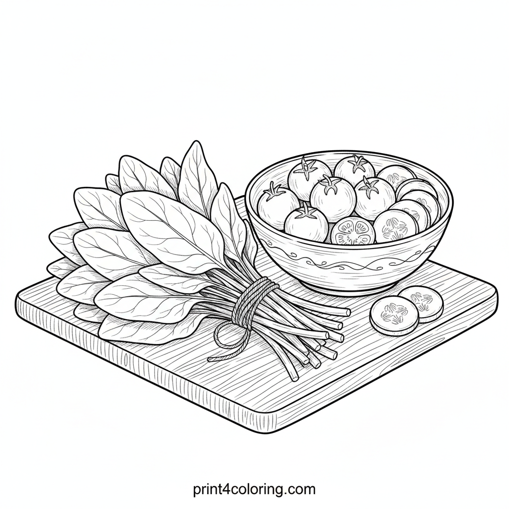 Explore the delightful details of a fresh garden harvest! This intricate page features vibrant spinach tied with twine on a textured wooden board. Beside it, a rustic ceramic bowl overflows with juicy cherry tomatoes and cool sliced cucumber, ready for your artistic touch. Bring this healthy bounty to life!
