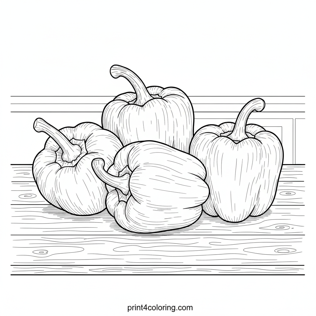 Explore a bountiful harvest scene featuring beautifully ripe bell peppers! Discover the shiny skins, gentle curves, and sturdy stems of red, yellow, green, and orange peppers resting on a rustic wooden table. This detailed illustration invites you to add vibrant colors and bring this delicious still life to life.