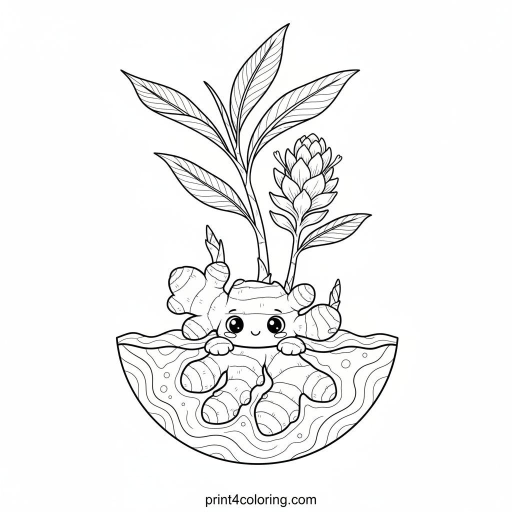 Uncover the hidden wonders of a ginger plant! This detailed page invites you to color its intricate underground rhizome, delicate sprouting roots, leafy stems, and a beautiful exotic flower. Explore textured soil and fine leaf veins, bringing this cozy botanical scene to life with your favorite colors.