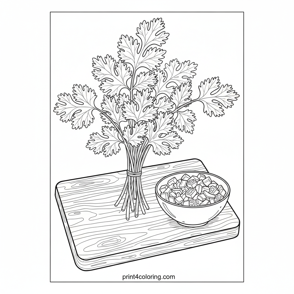 Get ready to color a beautiful close-up of fresh cilantro, just picked from the garden! It's laid out on a detailed wooden cutting board, with colorful diced vegetables waiting nearby. Imagine the delicious meals you could make with these vibrant ingredients. A perfect page for food lovers!