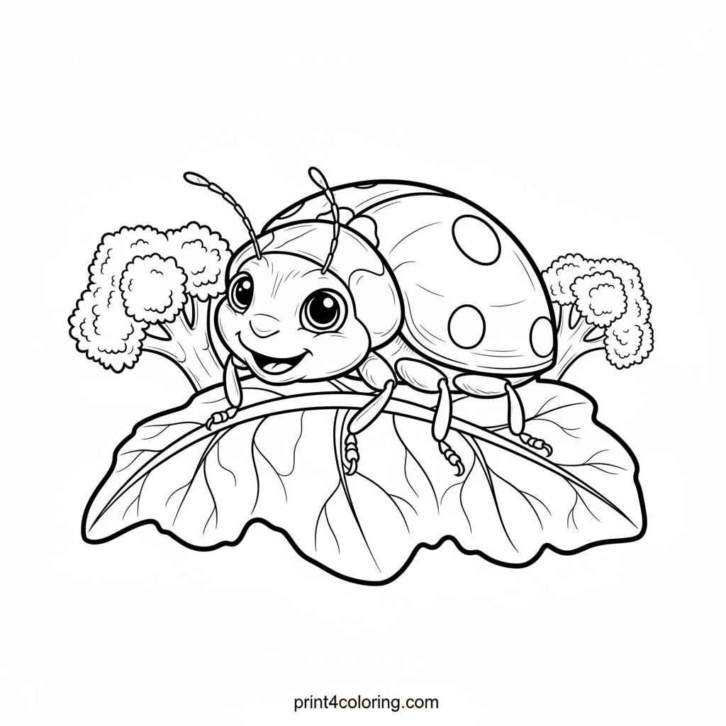 Discover the tiny world of a ladybug exploring a vibrant broccoli plant! This detailed illustration invites you to color intricate leaf veins and developing florets, all while a charming ladybug friend perches delicately. Bring this miniature garden scene to life with your favorite colors.