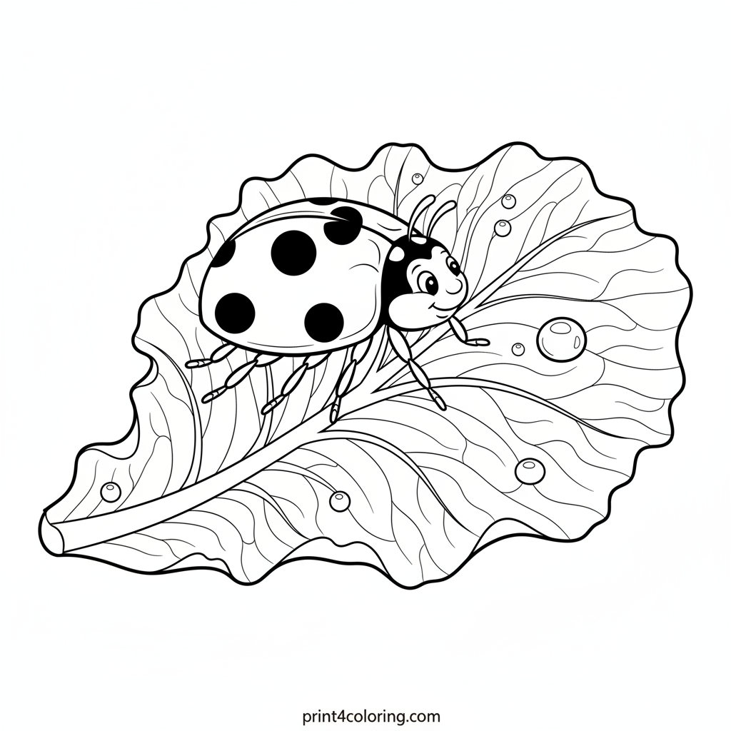 Get ready to color a charming close-up of a friendly ladybug! Watch as this little insect, with its distinct spots, carefully navigates a lush, dewy lettuce leaf, about to enjoy a delicious meal. Capture the intricate details of the leaf's folds and sparkling water droplets in your masterpiece.
