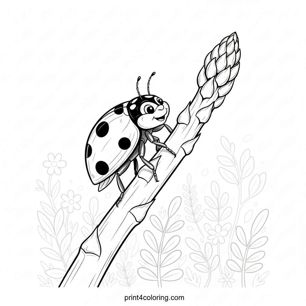 Watch a tiny ladybug embark on a grand adventure, carefully climbing a tall, tender asparagus spear! This detailed scene captures her journey with realistic spots and antennae, set against a softly blurred garden. Get ready to add vibrant colors to this delightful close-up of nature's small wonders.