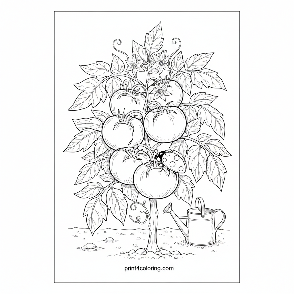 - 4🌈 Background Blend - Use soft greens, browns, and earthy tones for the soil and background elements like the watering can. Consider gentle shading to make the main tomato plant and ladybug pop forward.