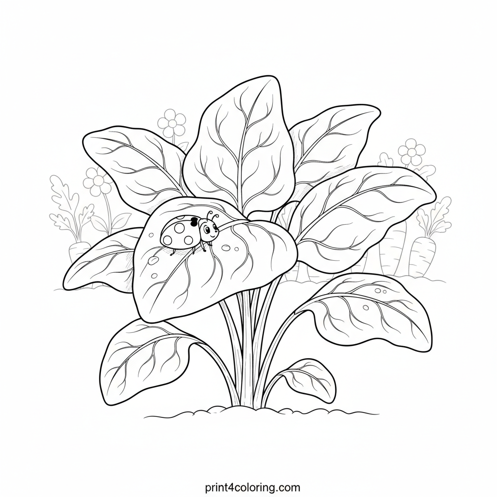 Explore a charming scene where a friendly ladybug finds its perfect spot on a lush, dew-kissed spinach leaf. This detailed botanical illustration invites you to color intricate vein patterns, the ladybug's realistic spots, and the vibrant greens of nature. A delightful challenge for expert colorists, bringing this tiny world to life!