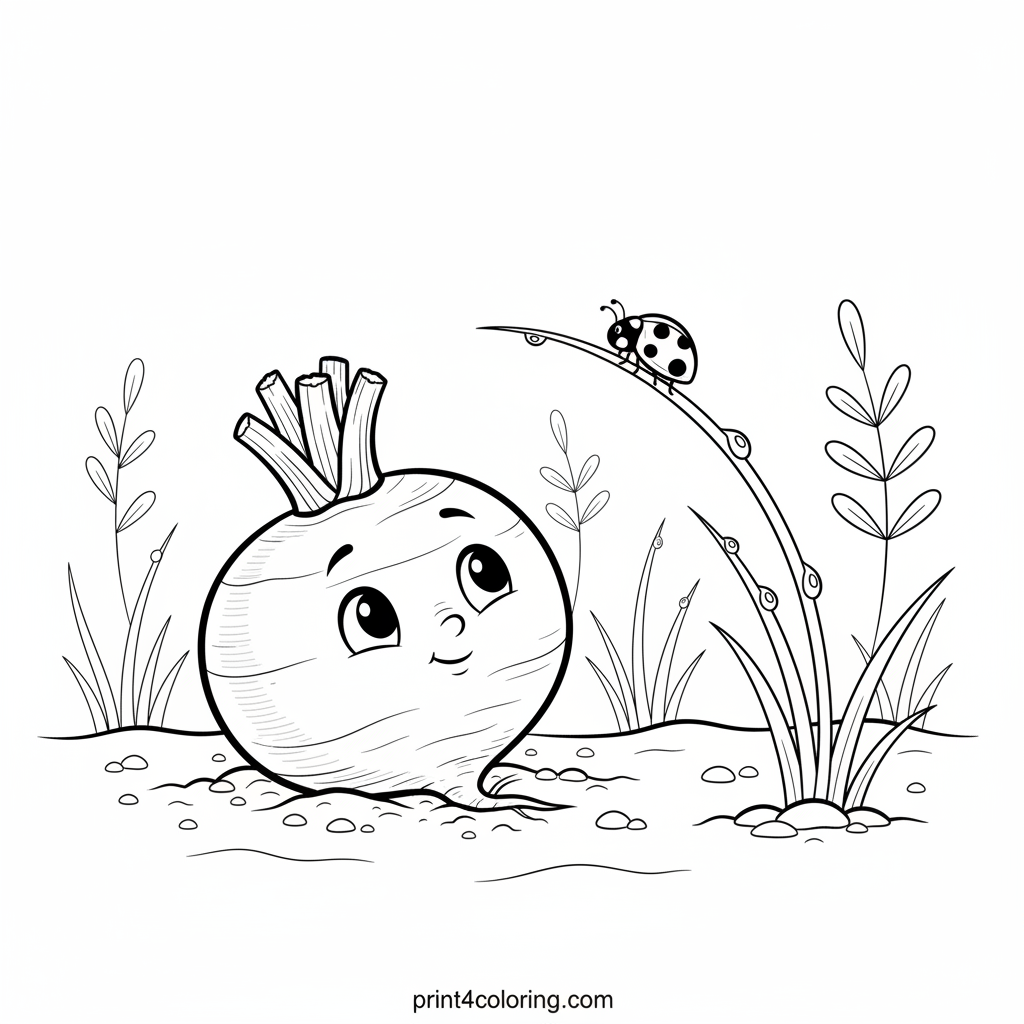 Discover the magic with a tiny, curious beet root peeking from the soil! It's amazed by a busy ladybug crawling on a dewy blade of grass, sparkling in the morning light. This charming scene invites you to color the wonder of nature's smallest moments.