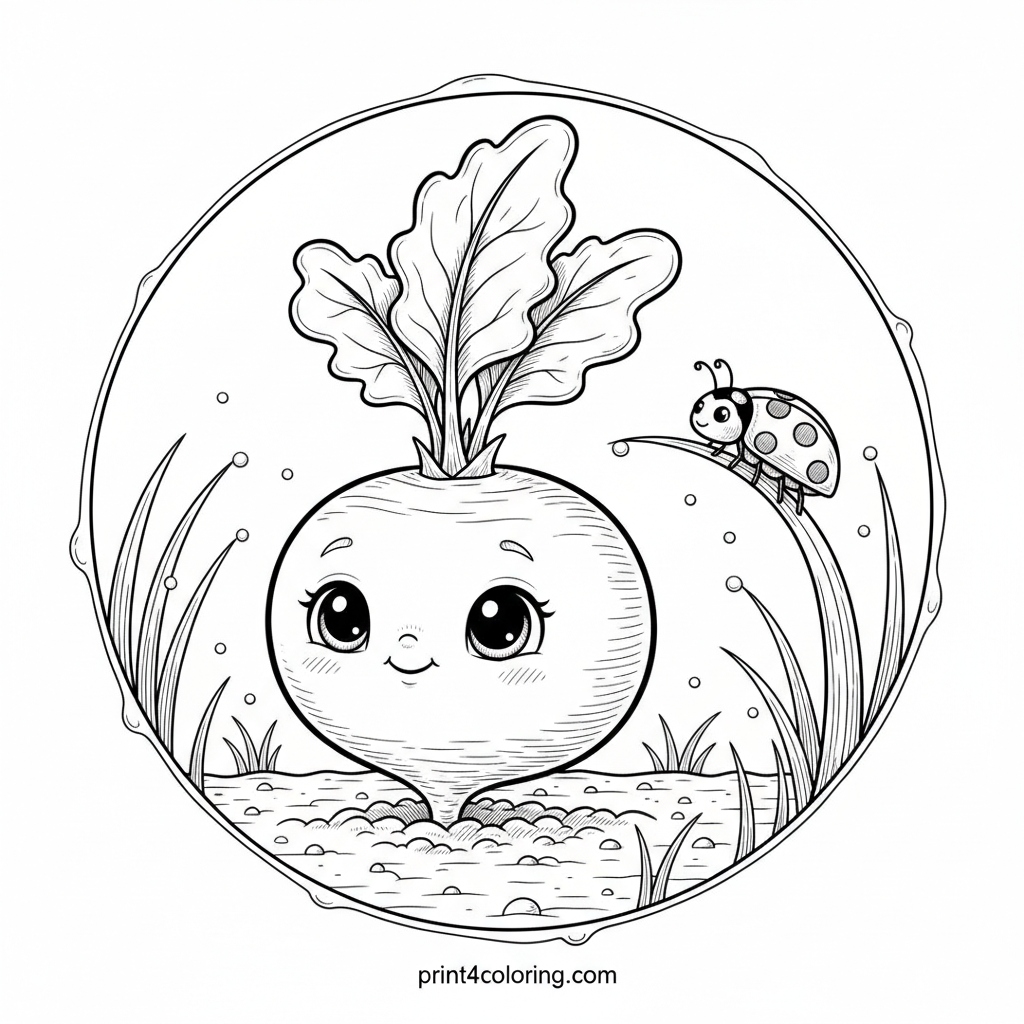Meet a tiny, curious beet root just peeking from the soil. It gazes in wonder at a busy ladybug crawling on a dewy blade of grass, sparkling in the gentle morning light. This cozy garden scene invites young artists to bring nature's small, vibrant wonders to life.