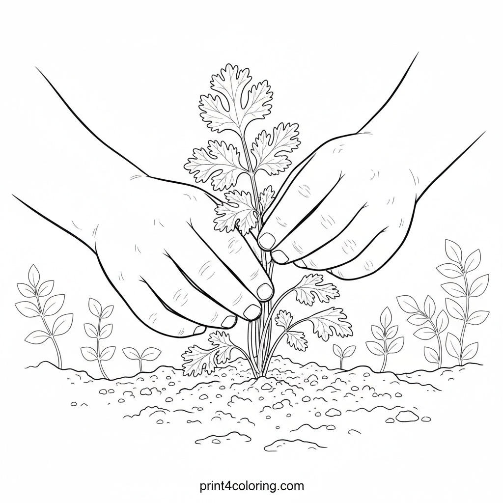 Step into a sunny garden scene! This detailed coloring page shows a child's gentle hands carefully plucking a fresh sprig of fragrant cilantro from a lush garden bed. Bring the vibrant greens of the plant and the earthy tones of the soil to life with your colors. A delightful harvest awaits!