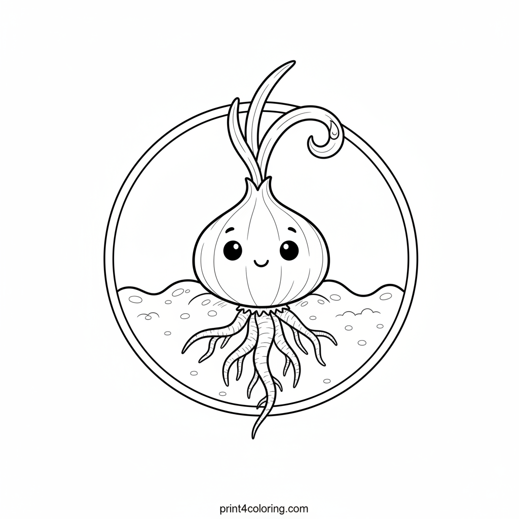 Witness the magical moment of a tiny onion bulb's first peek! This detailed coloring page shows a young onion pushing through rich soil, its delicate roots reaching down and a vibrant green shoot unfurling towards the sun. A sparkling dewdrop rests gently on its fresh leaf. A cozy scene perfect for budding artists!