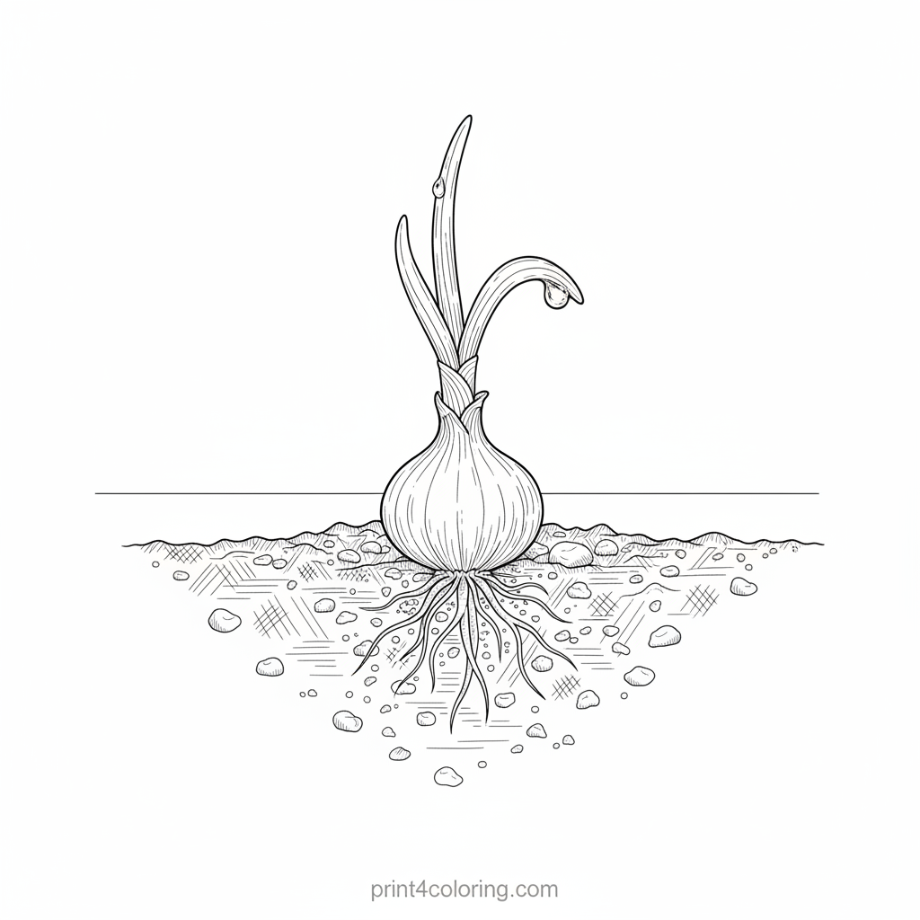 Witness the wonder of nature as a tiny onion bulb bravely pushes through the earth! Its delicate roots reach down, and a vibrant green shoot unfurls towards the sun. A sparkling dewdrop rests gently on its fresh leaf, inviting you to bring this beautiful scene to life with your favorite colors.