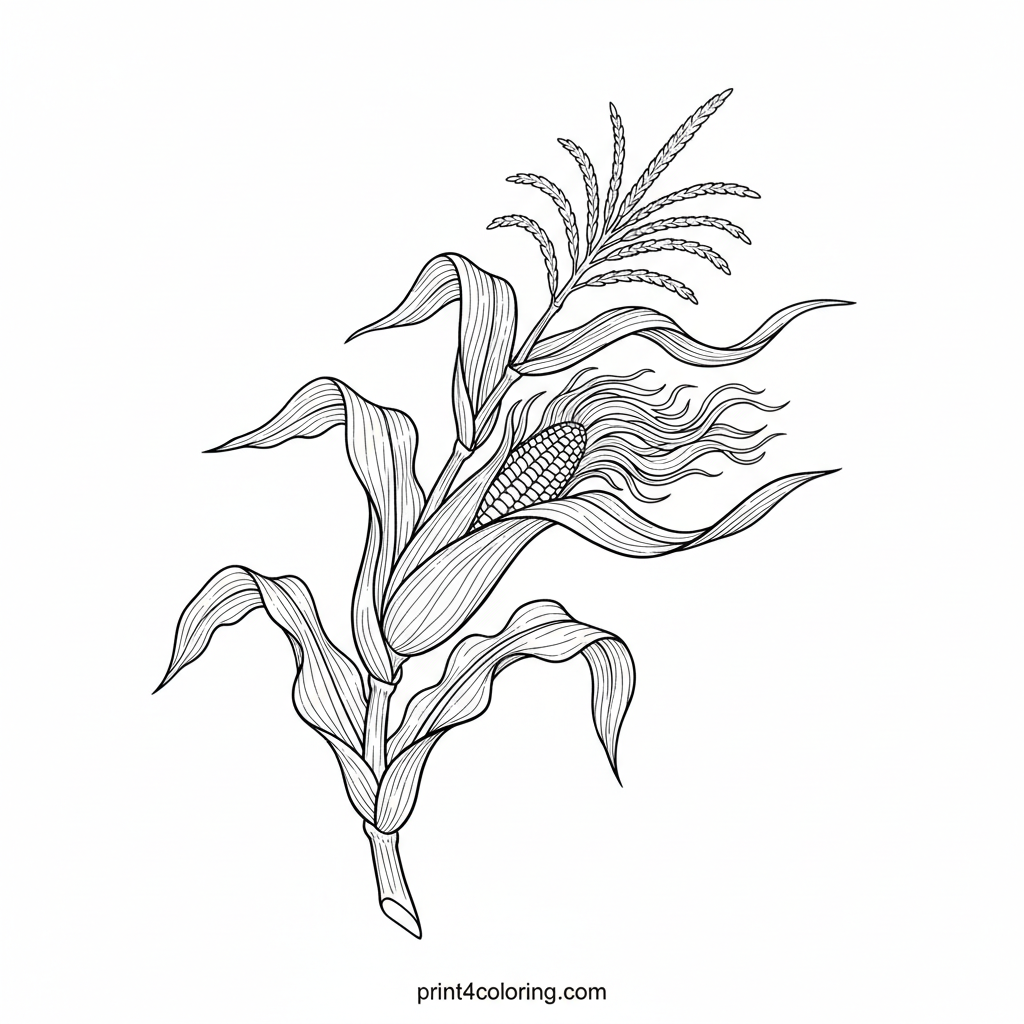 Dive into the intricate beauty of a mighty maize stalk! This detailed page invites you to color its strong fibrous stem, broad leaves with delicate veins, and a young ear of corn peeking out with silken threads. Discover the magic of nature's growth with every hue!