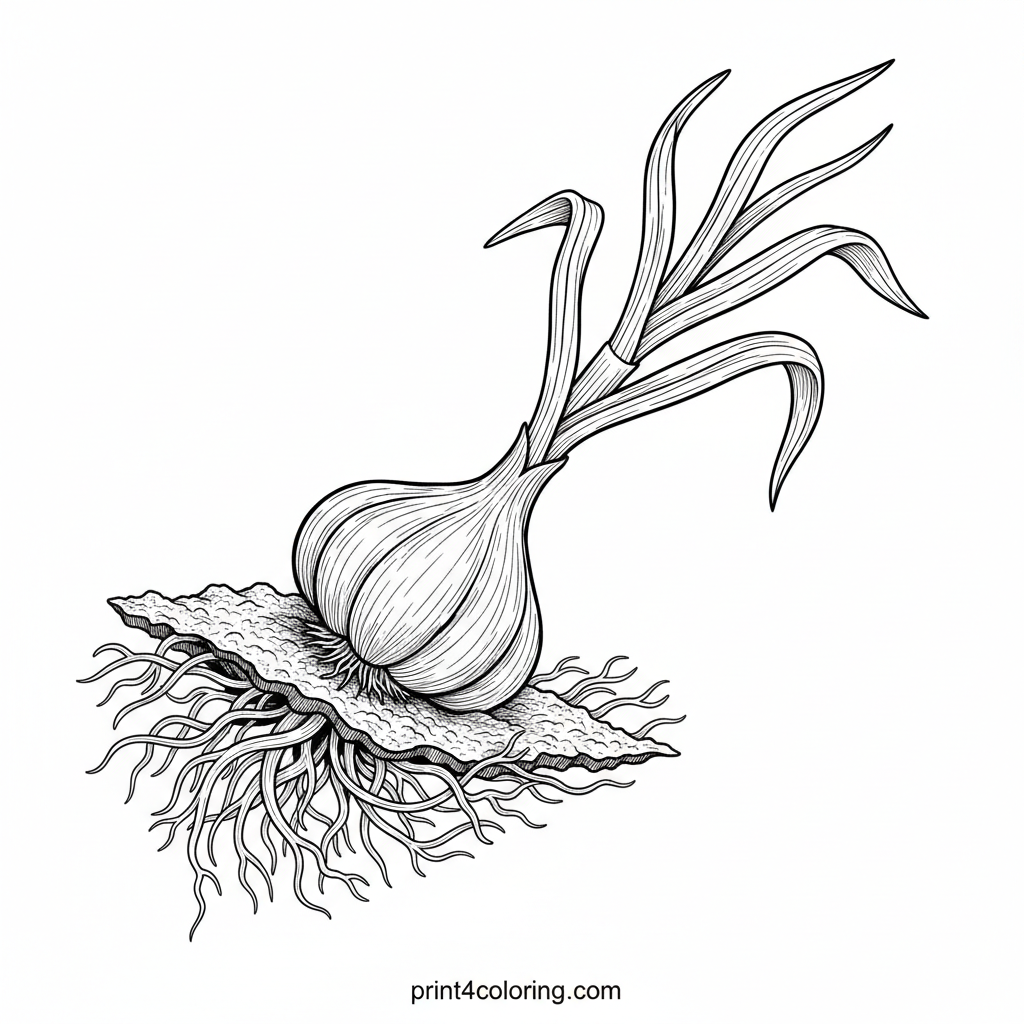 Dive into the hidden world of a growing garlic plant! This detailed page shows its powerful bulb nestled deep in the soil, with intricate roots reaching out. Tall, slender green leaves stretch towards the sun, inviting you to add vibrant colors and bring this botanical wonder to life.