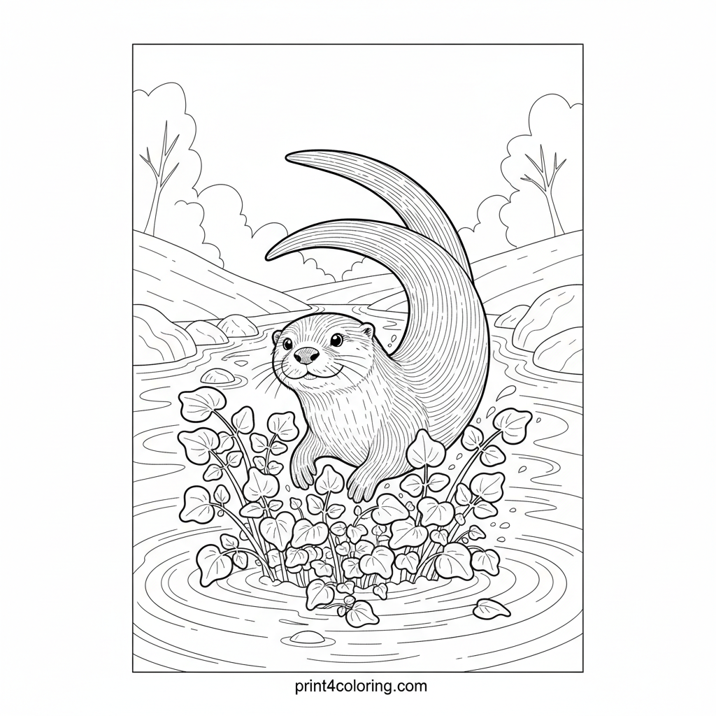 Dive into a delightful scene where a sleek, playful otter bobs and twirls amidst a lush patch of watercress. Watch as water ripples playfully around it in a clear stream, inviting you to add vibrant colors to its joyful movement and the intricate details of its natural, watery home.