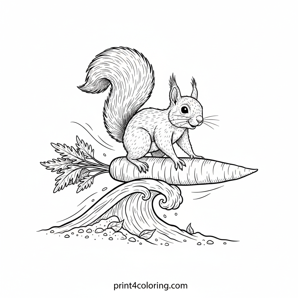 Catch a wave with our radical squirrel! This mischievous little adventurer is balancing expertly on a giant carrot surfboard, carving through a tiny wave of garden soil. Its bushy tail acts as a rudder, and the carrot leaves make a perfect sail. Get ready to color a scene full of garden fun and daring squirrel antics!