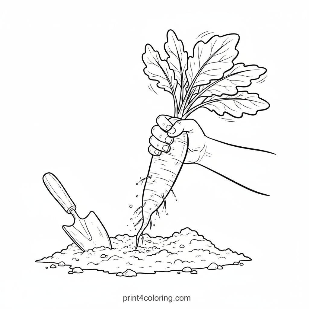 Dive into the joy of gardening with this detailed scene! A child's hand gently pulls a vibrant radish from the soil, revealing its crisp red skin, white tip, and intricate roots. Healthy green leaves still attached, and a garden trowel nearby, invite you to bring this fresh harvest to life with your colors.