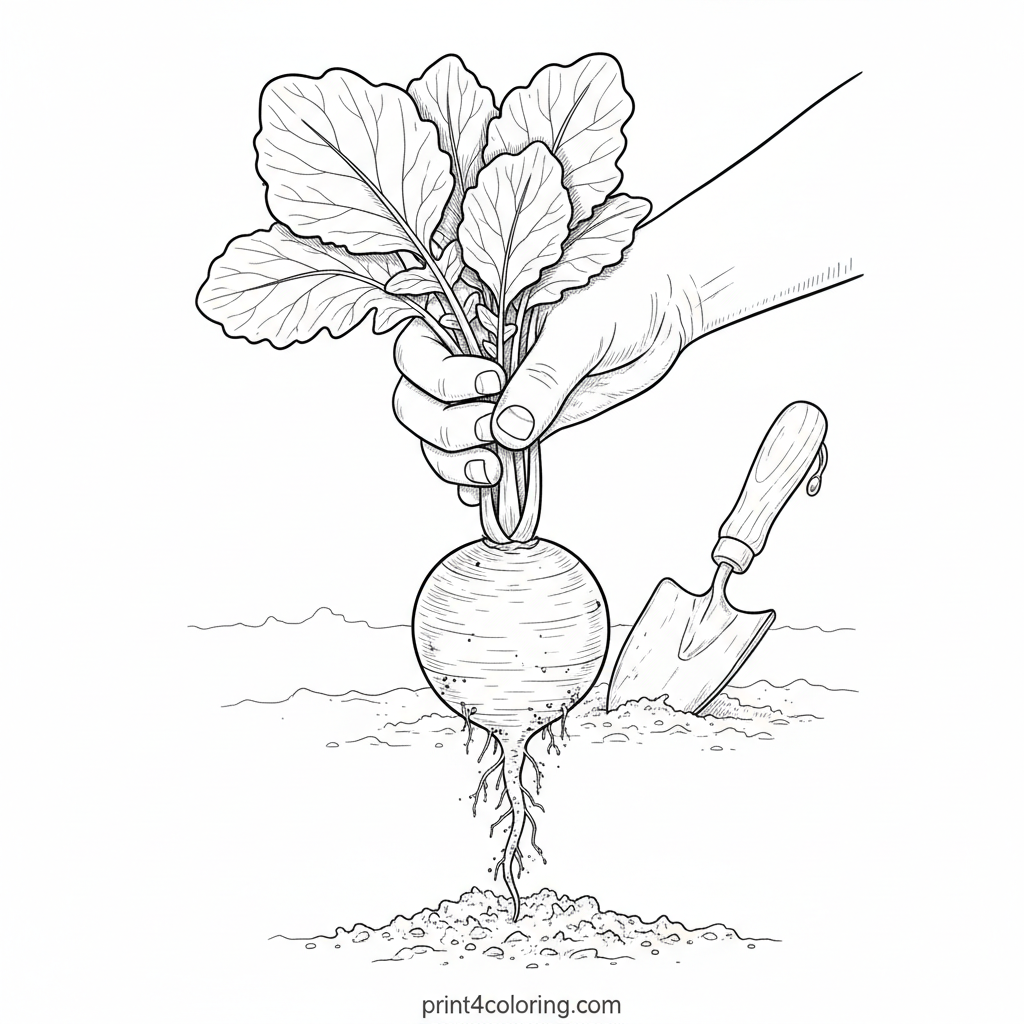 Dive into the delightful moment of harvesting a perfect radish! This close-up scene shows a child's hand gently pulling a vibrant red radish from the soil. Notice the tiny roots, clinging earth, and lush green leaves. A garden trowel rests nearby, inviting you to add color to this wonderful garden discovery.