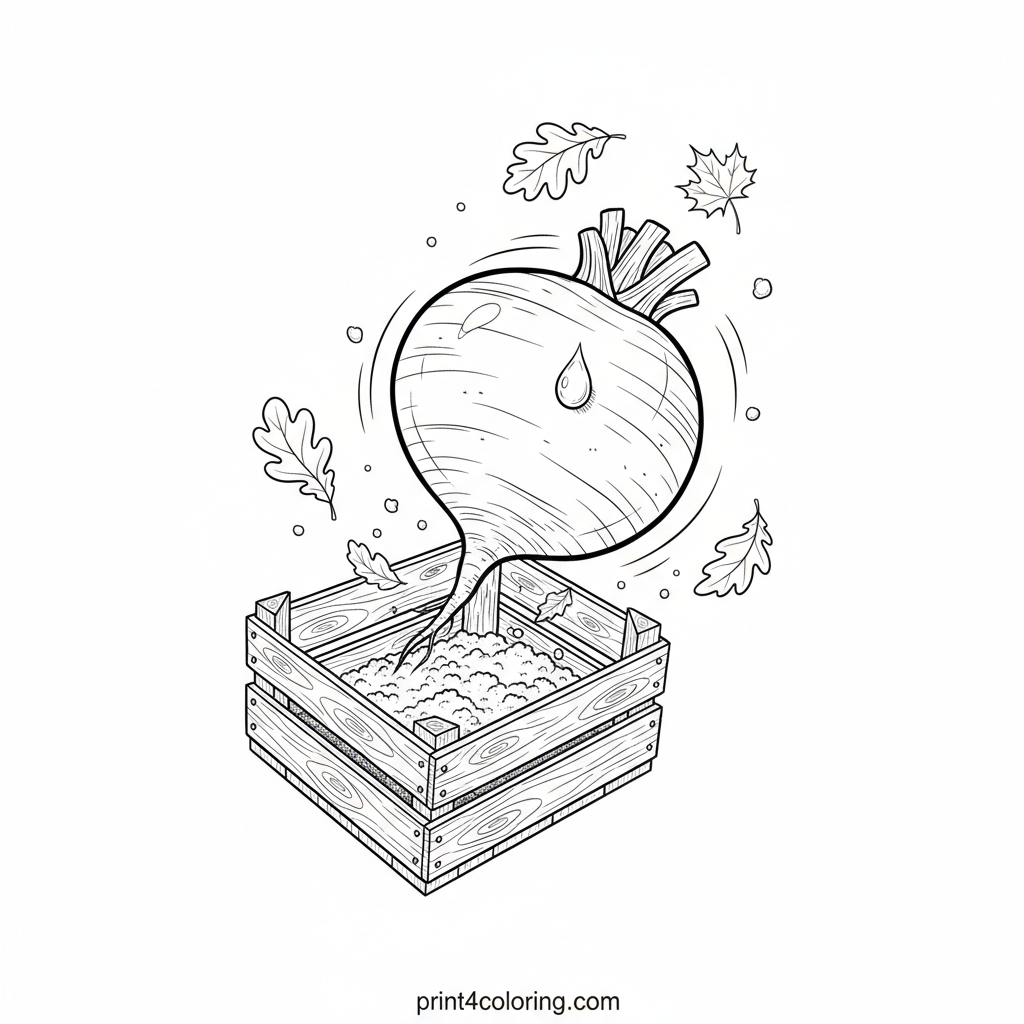 Discover the beauty of a freshly harvested beet root, still clinging to a bit of earth! This detailed coloring page shows a vibrant beet resting on a rustic wooden crate, surrounded by autumn leaves. Can you spot the tiny drop of morning dew? Bring this bountiful harvest scene to life with your colors!