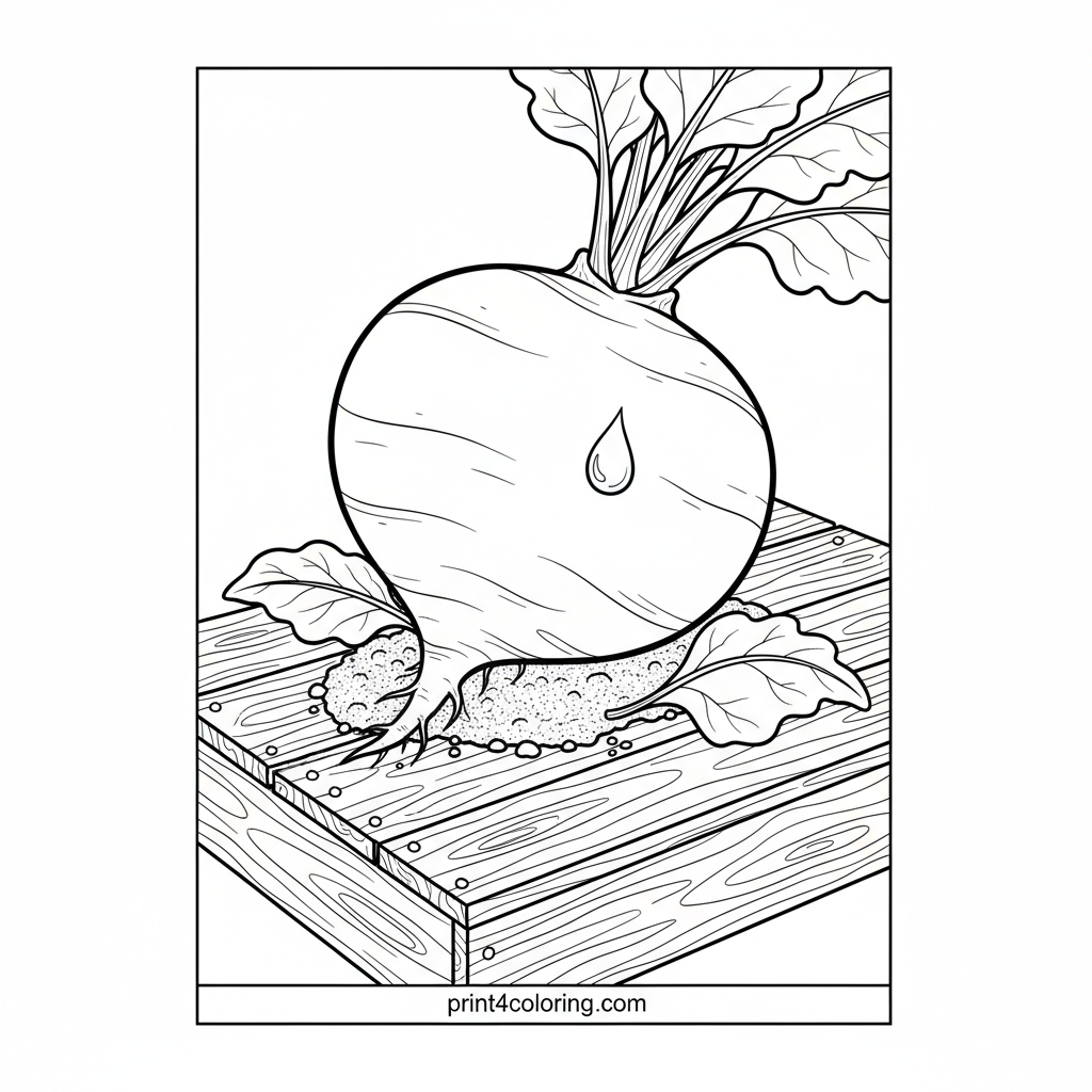 Dive into the beauty of the harvest season with this detailed coloring page. A magnificent beet root, fresh from the earth, sits proudly on a rustic wooden crate. Observe the tiny soil clumps, delicate fallen leaves, and a single glistening dewdrop, waiting for your artistic touch to bring its vibrant colors to life.