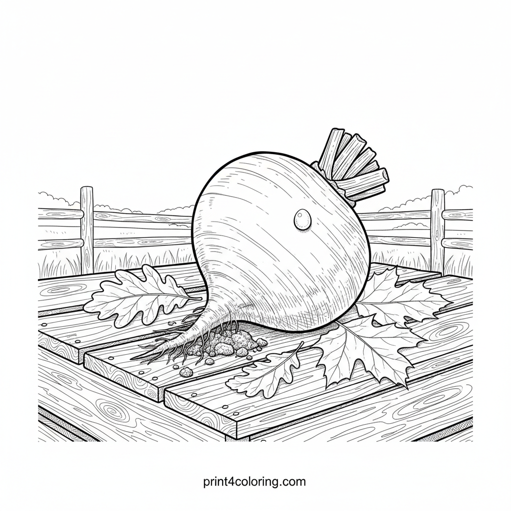 Immerse yourself in the beauty of harvest with this realistic coloring page. A freshly picked beet root, complete with earthy clumps and delicate roots, rests on a rustic wooden crate. Observe the intricate fallen leaves and a single, sparkling dewdrop, perfect for advanced colorists seeking a challenge.