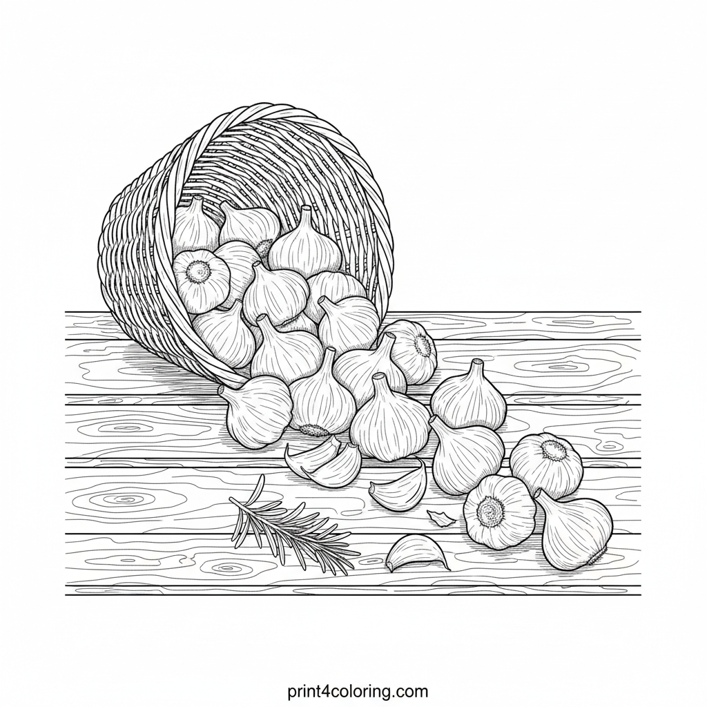 Step into a rustic farm kitchen with this detailed coloring page! Discover a woven basket overflowing with freshly picked garlic bulbs of all sizes. Look closely for individual cloves scattered on a textured wooden table, accompanied by a delicate herb sprig, ready for you to bring to life with vibrant colors.