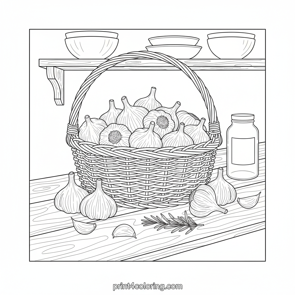 Dive into the cozy charm of a rustic garlic harvest! This detailed coloring page features a woven basket overflowing with plump garlic bulbs of all sizes. See individual cloves scattered on a textured wooden table, alongside a delicate herb sprig, waiting for your creative colors.