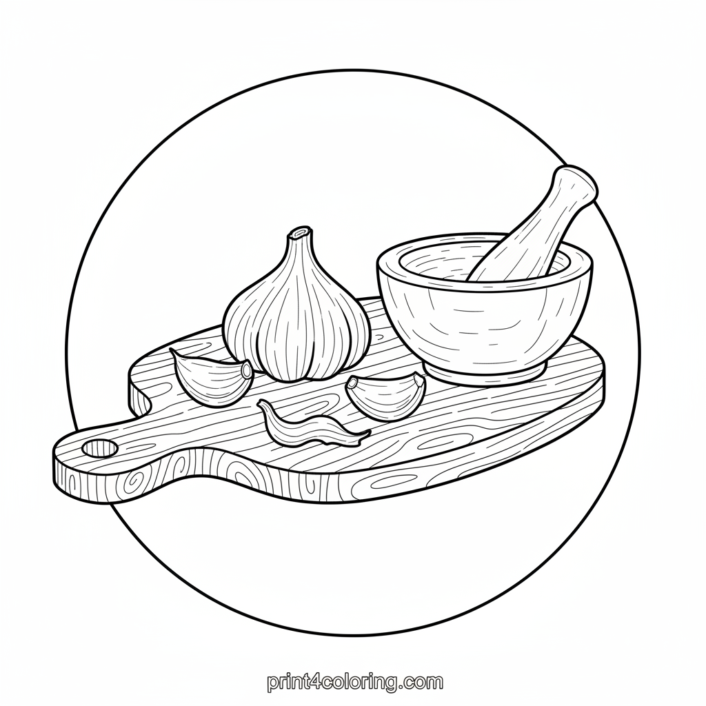 Step into a cozy kitchen scene! This detailed coloring page features a rustic wooden cutting board, a plump garlic bulb, and separated cloves. A classic ceramic mortar and pestle sits nearby, with a tiny, curled garlic skin adding realism. Perfect for practicing shading and texture in a charming still life.