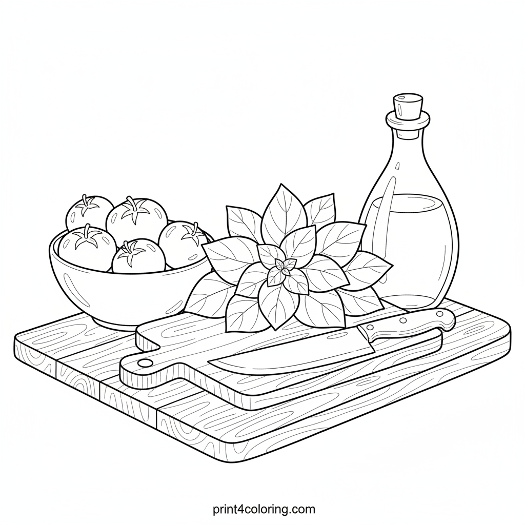 #basil#kitchen#cooking#food#still life#tomatoes#olive oil#rustic#realistic#coloring-page#printable