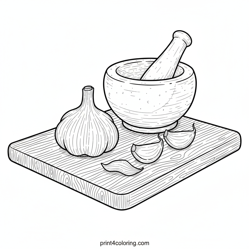 Explore the delightful details of a rustic kitchen counter! This coloring page features a wooden cutting board with a whole garlic bulb, separated cloves, and a classic ceramic mortar and pestle. A delicately curled garlic skin adds a realistic touch, perfect for exploring textures and shades.