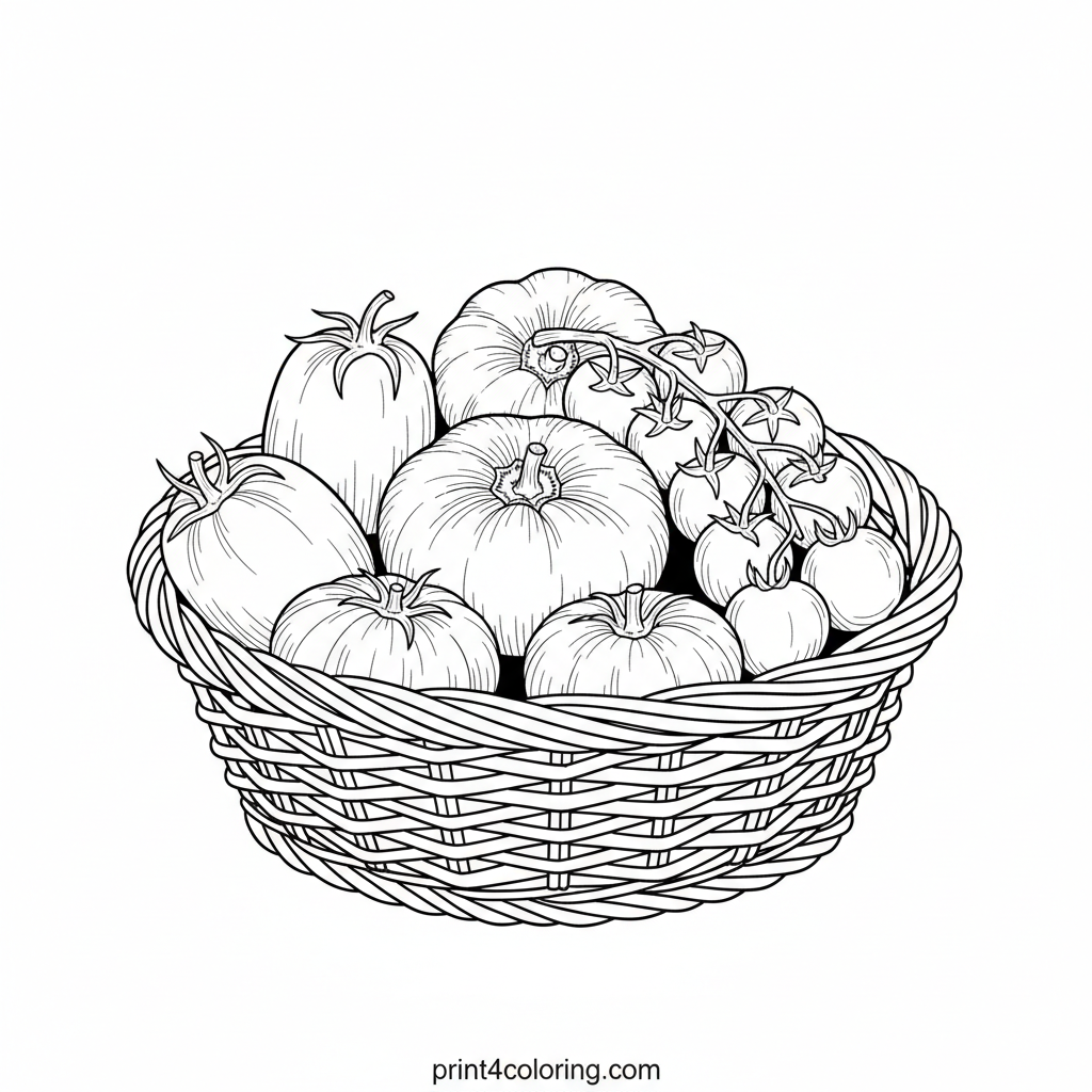 Dive into the rich colors of a freshly picked harvest! This expert coloring page features a rustic woven basket overflowing with a delightful variety of ripe tomatoes. From plump beefsteaks to tiny cherry tomatoes on the vine, explore intricate details and textures. A true celebration of garden bounty, ready for your artistic touch!