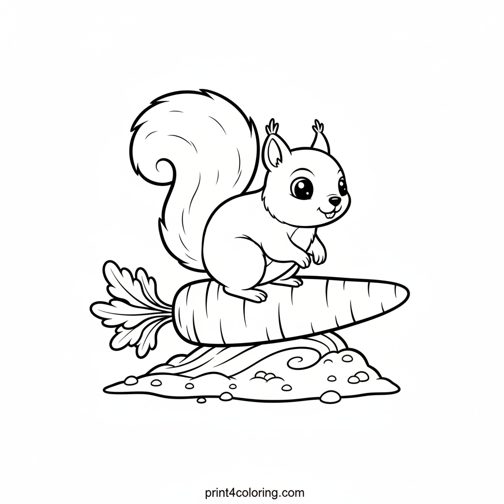 Dive into a whimsical garden scene where a mischievous squirrel has turned a giant carrot into an epic surfboard! Watch as it expertly balances, riding a wave of garden soil with its bushy tail flowing and carrot leaves as a tiny sail. A delightful adventure awaiting your colors!
