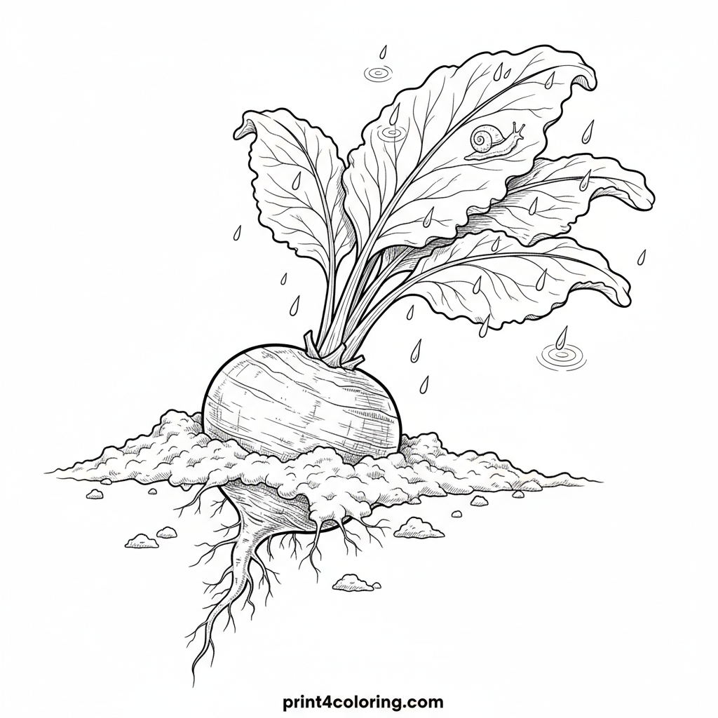 Explore the detailed world of a plump beet root, snuggled deep in its cozy garden bed. Its strong roots reach down, while vibrant green leaves unfurl above, glistening with raindrops. Spot the tiny snail on an adventure across a leaf! A wonderful scene for expert colorists.